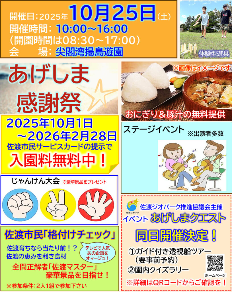 現在、佐渡市民の皆様には佐渡市民サービスカード提示で入園無料となります謝恩企画を開催しております。本件イベントにつきましても尖閣湾揚島遊園をより身近に感じていただけるよう開催するものです。